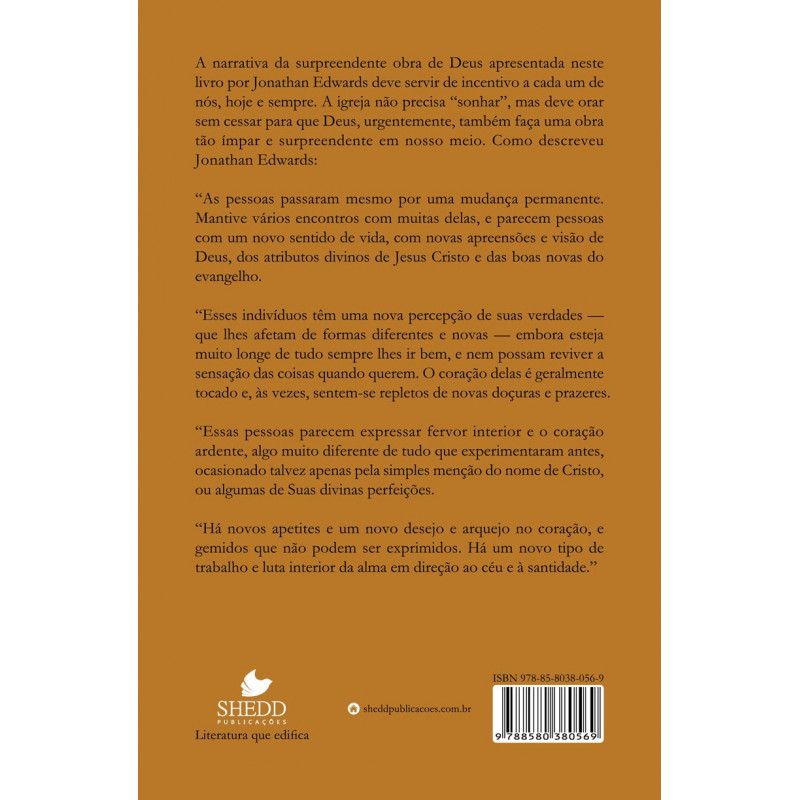 A narrativa da surpreendente obra de Deus apresentada neste livro por Jonathan Edwards deve servir de incentivo a cada um de nós, hoje e sempre. A igreja não precisa “sonhar”, mas deve orar sem cessar para que Deus, urgentemente, também faça uma obra tão ímpar e surpreendente em nosso meio. Como descreveu Jonathan Edwards: “Há novos apetites e um novo desejo e arquejo no coração, e gemidos que não podem ser exprimidos. Há um novo tipo de trabalho e luta interior da alma em direção ao céu e à santidade.”