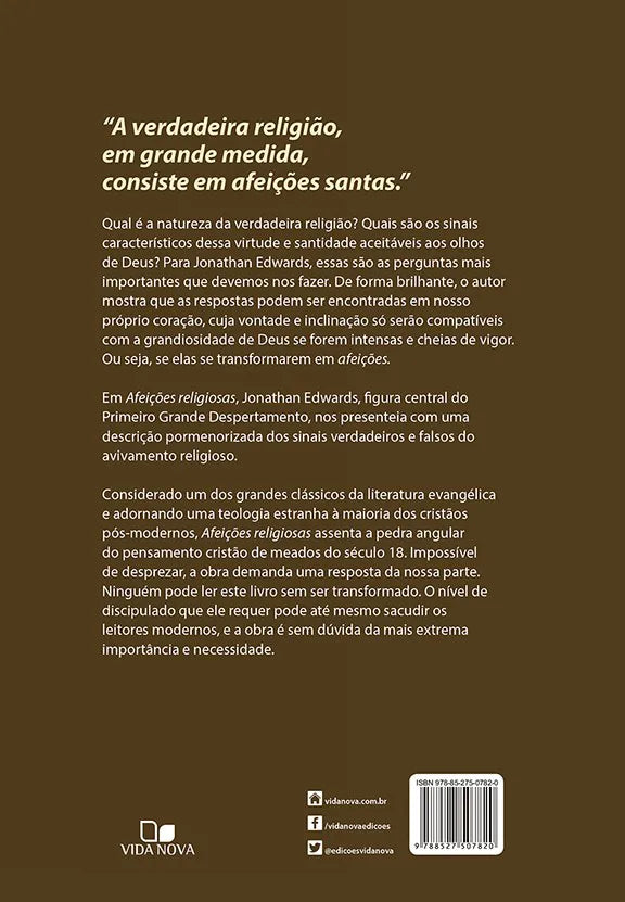 Qual é a natureza da verdadeira religião? Quais são os sinais característicos dessa virtude e santidade aceitáveis aos olhos de Deus? Para Jonathan Edwards, essas são as perguntas mais importantes que devemos nos fazer. De forma brilhante, o autor mostra que as respostas podem ser encontradas em nosso próprio coração, cuja vontade e inclinação só serão compatíveis com a grandiosidade de Deus se forem intensas e cheias de vigor. Ou seja, se elas se transformarem em afeições.