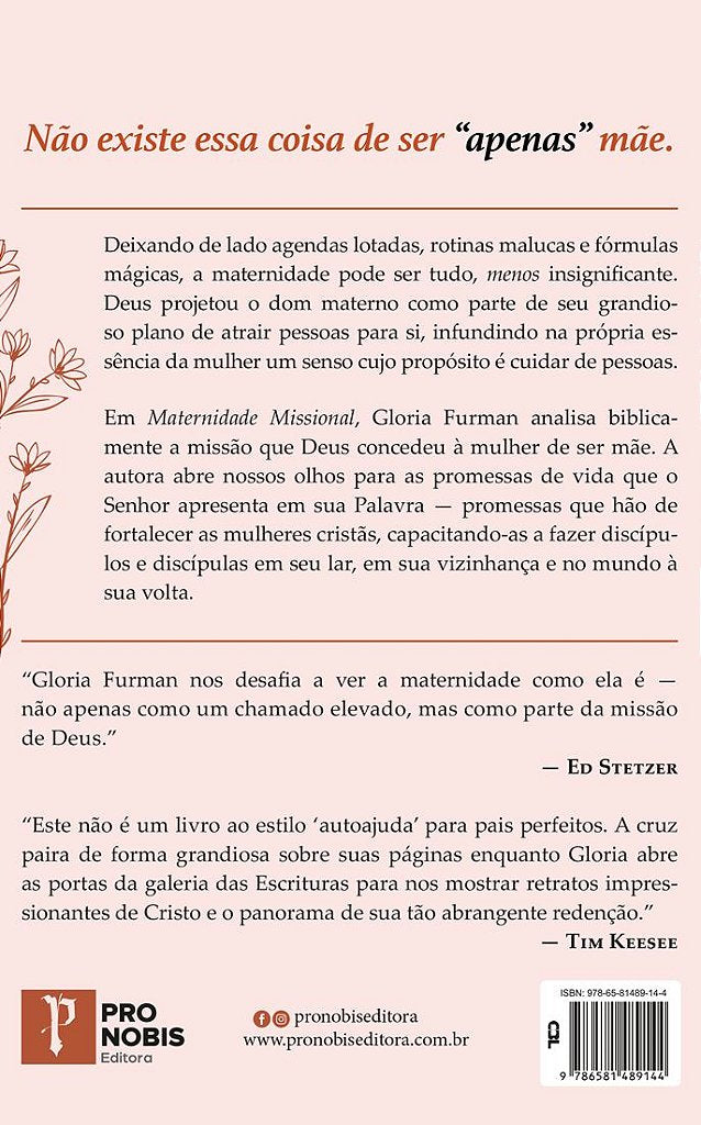 Em Maternidade Missional, Gloria Furman analisa biblicamente a missão que Deus concedeu à mulher de ser mãe. A autora abre nossos olhos para as promessas de vida que o Senhor apresenta em sua Palavra — promessas que hão de fortalecer as mulheres cristãs, capacitando-as a fazer discípulos e discípulas em seu lar, em sua vizinhança e no mundo à sua volta.