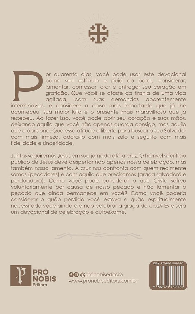 Que essa atitude o liberte para buscar o seu Salvador com mais firmeza, adorá-lo com mais zelo e segui-lo com mais fidelidade e sinceridade. Juntos seguiremos Jesus em sua jornada até a cruz. O horrível sacrifício público de Jesus deve despertar não apenas nossa celebração, mas também nosso lamento. A cruz nos confronta com quem realmente somos (pecadores) e com aquilo que precisamos (graça salvadora e perdoadora).