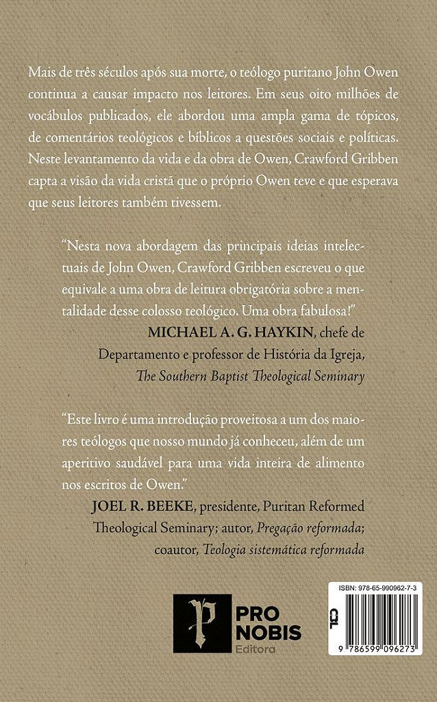 “Estudar a vida e a teologia de John Owen é como visitar um restaurante self-service — algo delicioso, mas também arrebatador, resultando em satisfação, mas também nos deixando com a sensação de que não experimentamos tudo. Crawford Gribben nos serve uma amostra de um misto interessante de biografia e doutrina, tudo aromatizado com o penetrante molho da visão de Owen acerca da santidade e temperado com a interpretação particular de Gribben a respeito da história desse teólogo. Este livro é uma introdução preciosa a um dos maiores teólogos que o mundo já conheceu, além de um aperitivo saudável para uma vida inteira de banquetes nos escritos de Owen.”