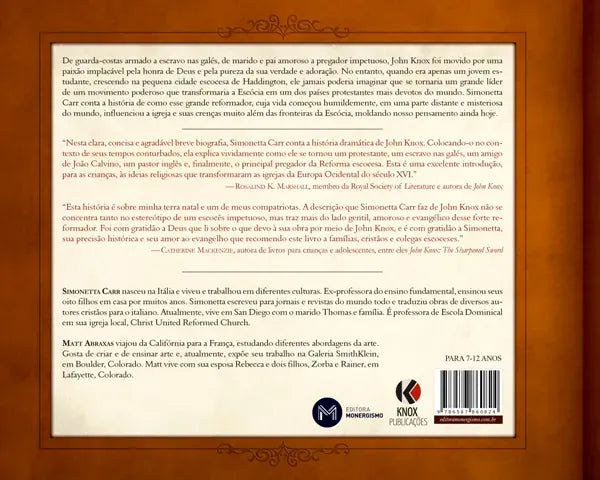 "Nesta clara, concisa e agradável breve biografia, Simonetta Carr conta a história dramática de John Knox. Colocando-o no contexto de seus tempos conturbados, ela explica vividamente como ele se tornou um protestante, um escravo nas galés, um amigo de João Calvino, um pastor inglês e, finalmente, o principal pregador da Reforma escocesa. Esta é uma excelente introdução, para as crianças, às ideias religiosas que transformaram as igrejas da Europa Ocidental do século XVI.”