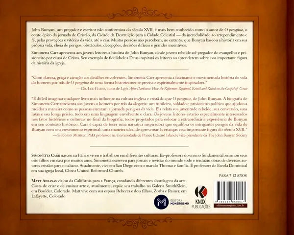 Simonetta Carr apresenta aos jovens leitores a história de John Bunyan, desde jovem rebelde até pregador do evangelho e prisioneiro por causa de Cristo. Seu exemplo de fidelidade a Deus inspirará os leitores ao aprenderem sobre essa importante figura da história da igreja.