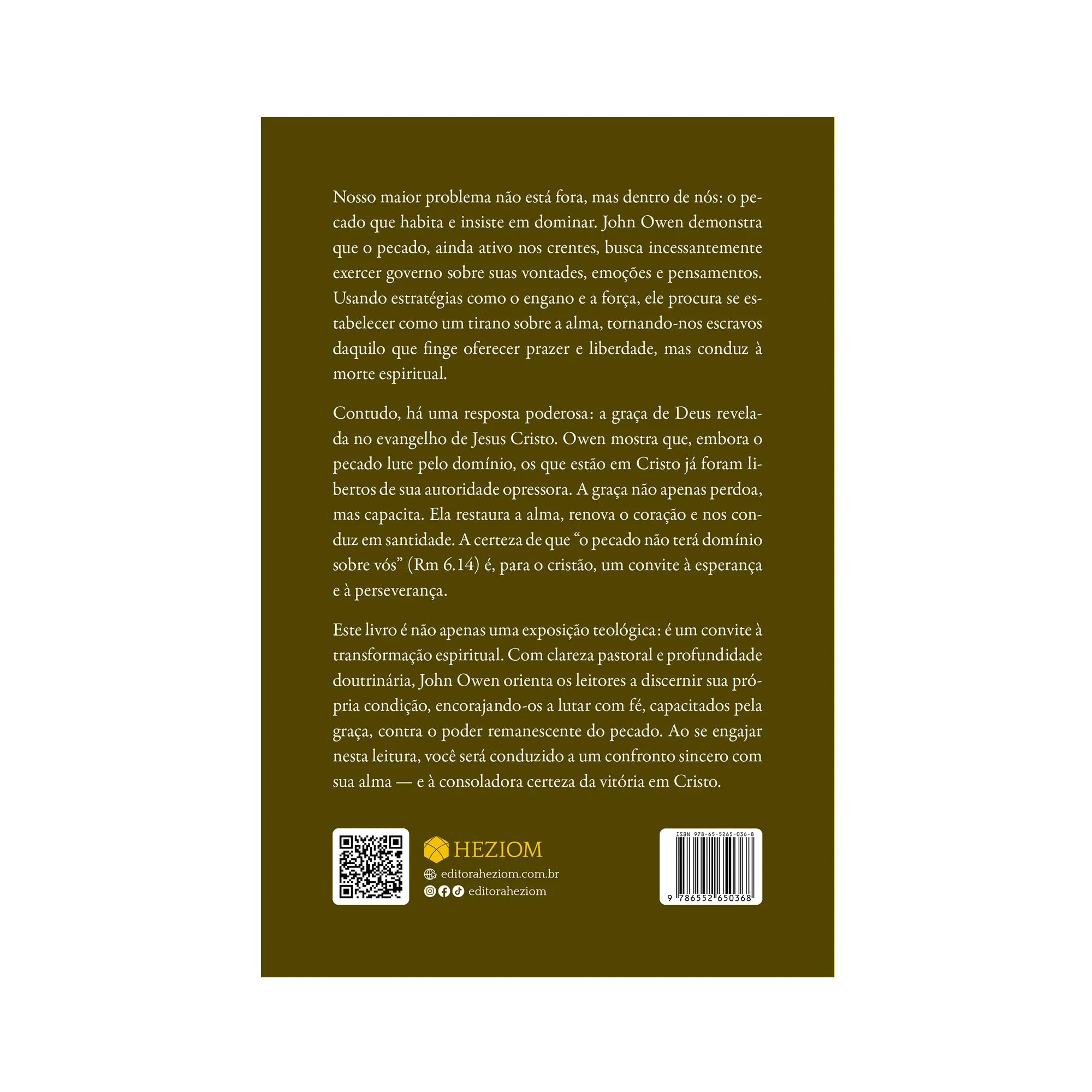 Nosso maior problema não está fora, mas dentro de nós: o pecado que habita e insiste em dominar. John Owen demonstra que o pecado, ainda ativo nos crentes, busca incessantemente exercer governo sobre suas vontades, emoções e pensamentos. Usando estratégias como o engano e a força, ele procura se estabelecer como um tirano sobre a alma, tornando-nos escravos daquilo que finge oferecer prazer e liberdade, mas conduz à morte espiritual.