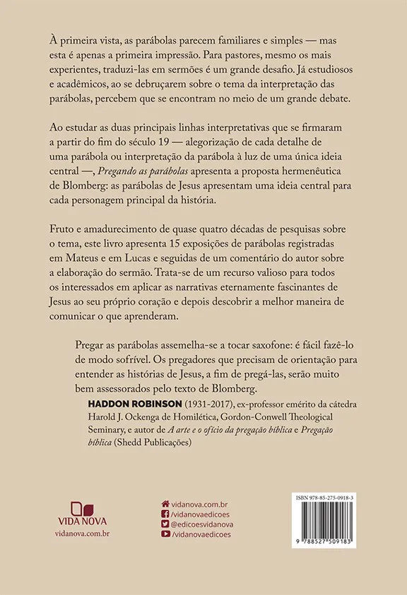 Fruto e amadurecimento de quase quatro décadas de pesquisas sobre o tema, este livro apresenta 15 exposições de parábolas registradas em Mateus e em Lucas, seguidas de um comentário do autor sobre a elaboração do sermão. Trata-se de um recurso valioso para todos os interessados em aplicar as narrativas eternamente fascinantes de Jesus ao seu próprio coração e depois descobrir a melhor maneira de comunicar o que aprenderam.