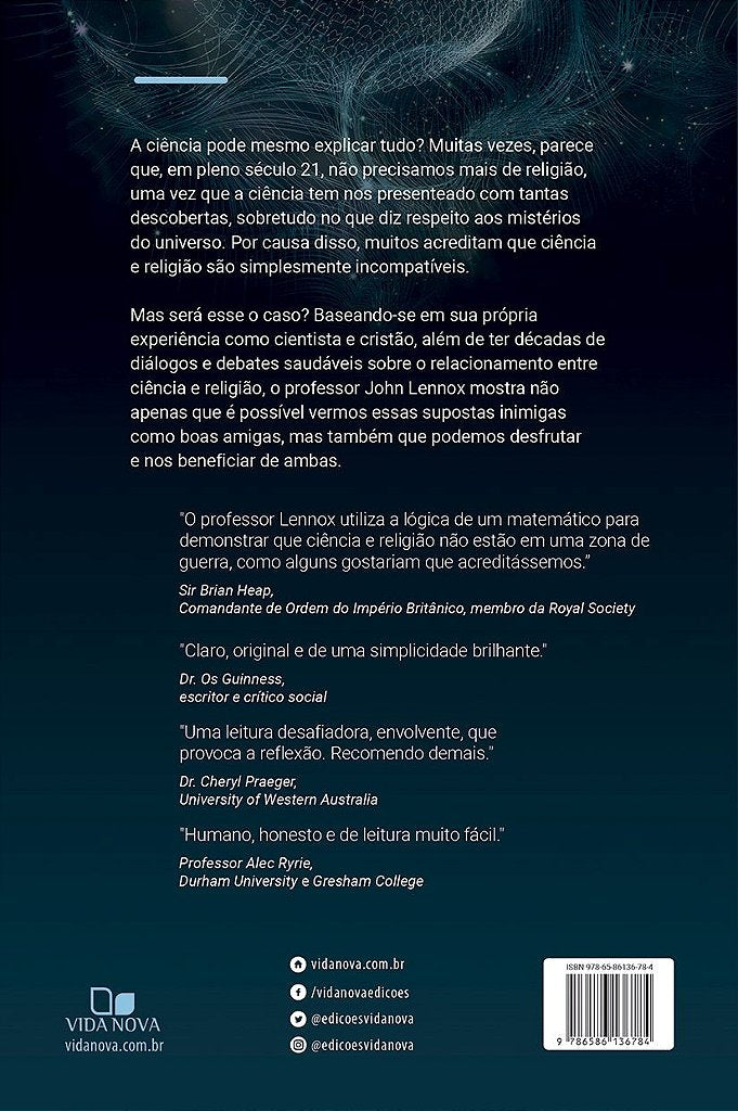 Mas será esse o caso? Baseando-se em sua própria experiência como cientista e cristão, além de ter décadas de diálogos e debates elevados sobre o relacionamento entre ciência e religião, o professor John Lennox mostra não apenas que é possível vermos essas supostas inimigas como boas amigas, mas também que podemos desfrutar e nos beneficiar de ambos.