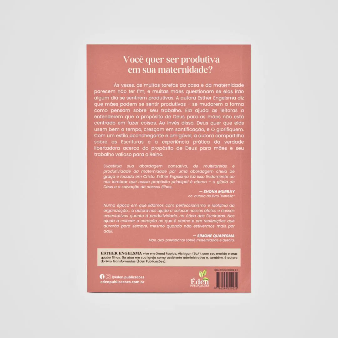 Às vezes, as muitas tarefas da casa e da maternidade parecem não ter fim, e muitas mães questionam se elas irão algum dia se sentirem produtivas. A autora Esther Engelsma diz que mães podem se sentir produtivas - se mudarem a forma como pensam sobre seu trabalho. Ela ajuda as leitoras a entenderem que o propósito de Deus para as mães não está centrado em fazer coisas. Ao invés disso, Deus quer que elas usem bem o tempo, cresçam em santificação, e O glorifiquem. Com um estilo aconchegante e amigável, a autora compartilha sobre as Escrituras e a experiência prática da verdade libertadora acerca do propósito de Deus para mães e seu trabalho valioso para o Reino.