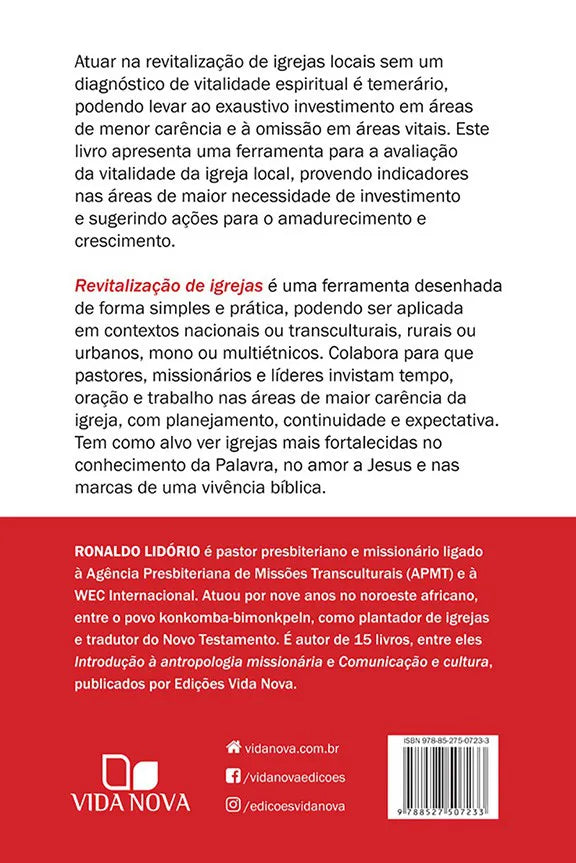 Atuar na revitalização de igrejas locais sem um diagnóstico de vitalidade espiritual é temerário, podendo levar ao exaustivo investimento em áreas de menor carência e à omissão em áreas vitais. Este livro apresenta uma ferramenta para a avaliação da vitalidade da igreja local, provendo indicadores nas áreas de maior necessidade de investimento e sugerindo ações para o amadurecimento e crescimento.