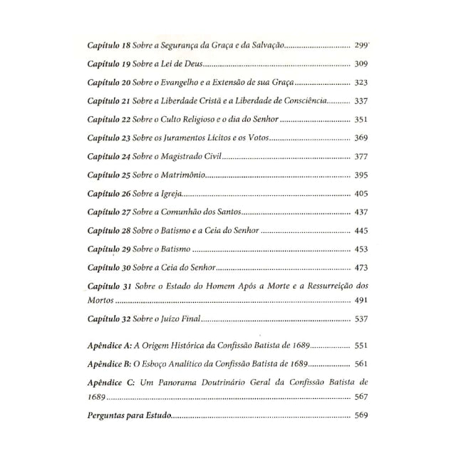 Por exemplo: no capítulo 1, Sobre as Escrituras Sagradas, ele lembra o leitor que cada uma das dez sentenças da Confissão são também respostas a erros do catolicismo romano. Referindo-se ao cessacionismo da Confissão, ele lembra que essa era uma resposta aos erros dos anabatistas e seu carismatismo. Todo o comentário é perpassado por ele com explicações como essas. O comentário segue a mesma estrutura do esboço. Além do comentário dos 32 capítulos, os apêndices do livro também são pontos altos. Temos aqui: (1) Origem e história da Confissão de Fé Batista de 1689; (2) Esboço analítico da Confissão de Fé Batista de 1689; (3) Um programa geral doutrinário da Confissão Batista de 1689; (4) Perguntas para estudo.