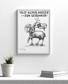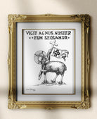 O print Agnus Dei (“O Cordeiro de Deus”) representa uma das mais antigas e belas expressões visuais da fé cristã. A arte, criada pelo desenhista Marcos Rodrigues, retrata o Cordeiro vitorioso com a bandeira da cruz e a inscrição em latim “Vicit Agnus Noster, Eum Sequámur”, que significa “Nosso Cordeiro venceu, sigamo-lo.”