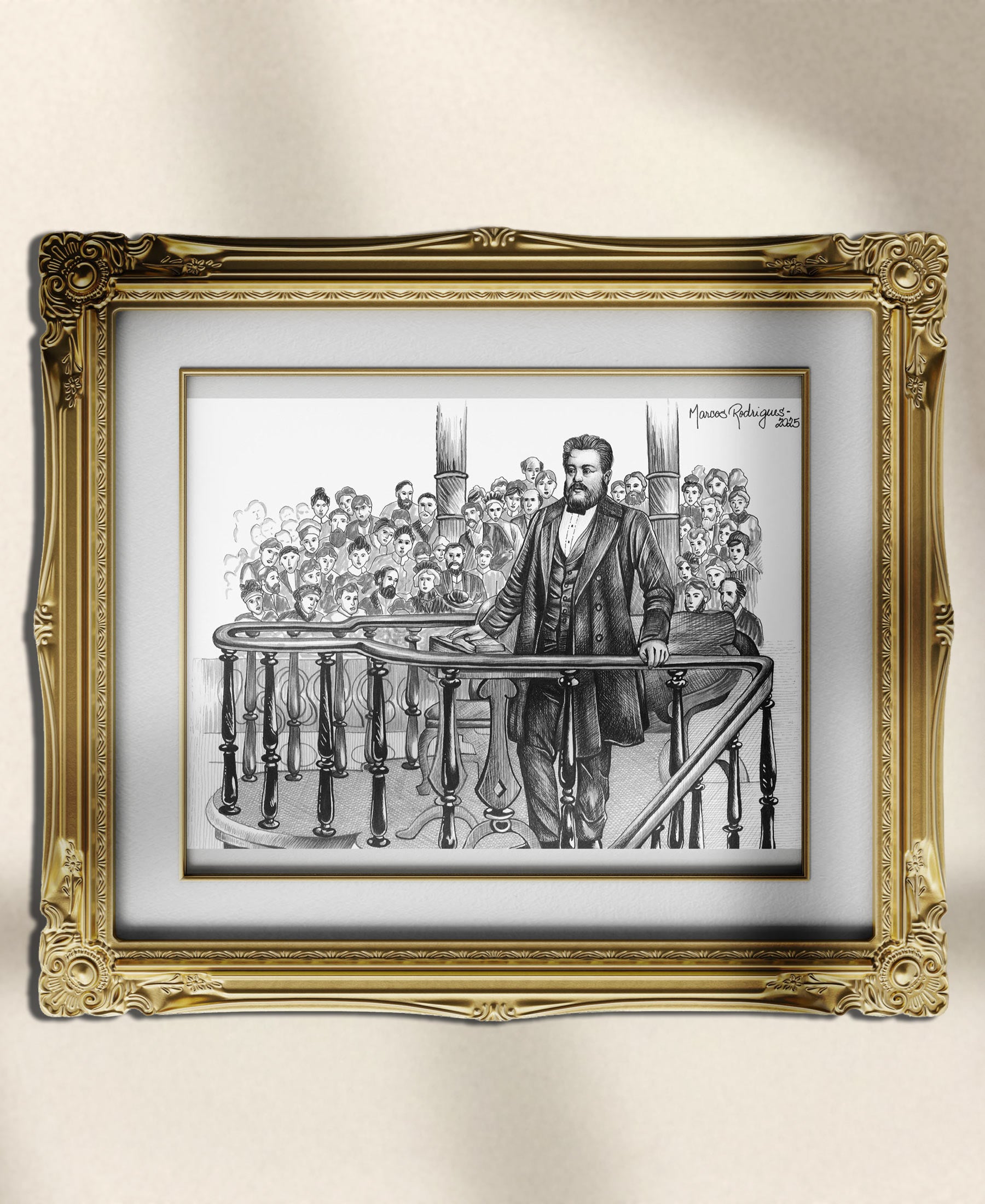 Esta arte é resultado da parceria entre a Livraria Defesa do Evangelho e o desenhista Marcos Rodrigues, que retrata Spurgeon com traços expressivos, capturando sua profundidade espiritual e legado reformado.