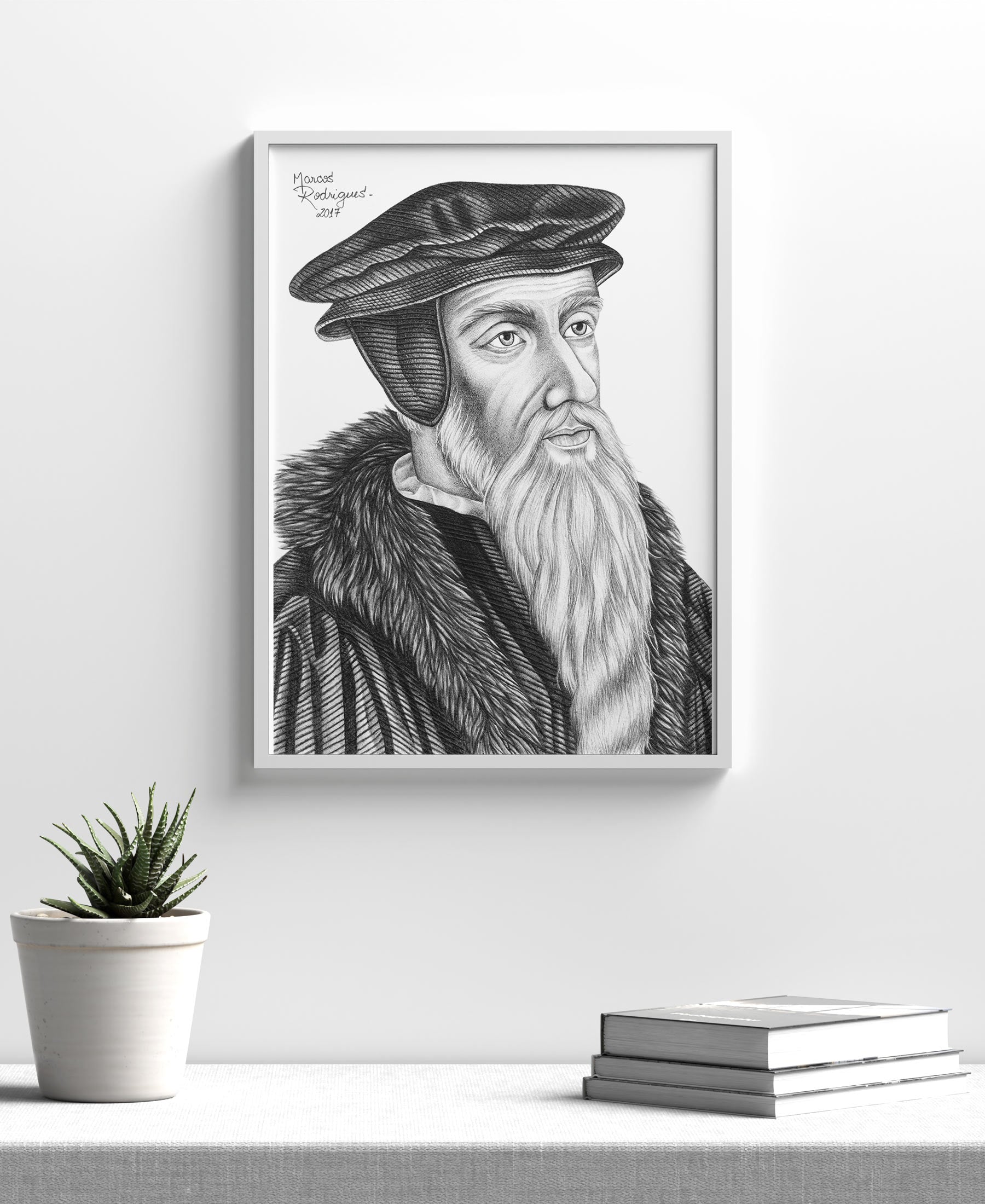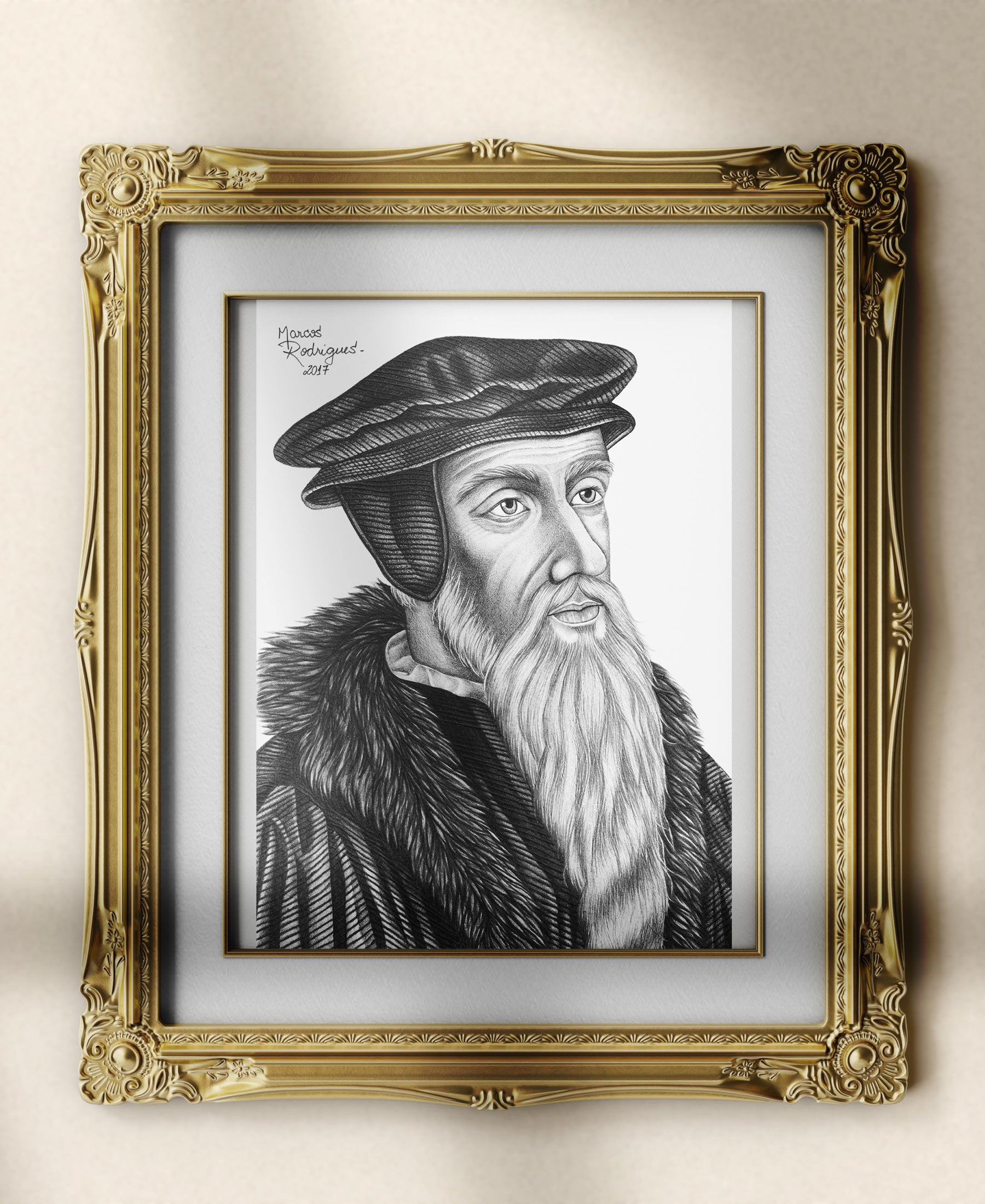 Print artístico exclusivo com o retrato de João Calvino (1509–1564), reformador francês e um dos principais teólogos da Reforma Protestante. Fundador da Academia de Genebra e autor das célebres Institutas da Religião Cristã, Calvino moldou a teologia reformada com ênfase na soberania de Deus, na graça irresistível e na centralidade das Escrituras.