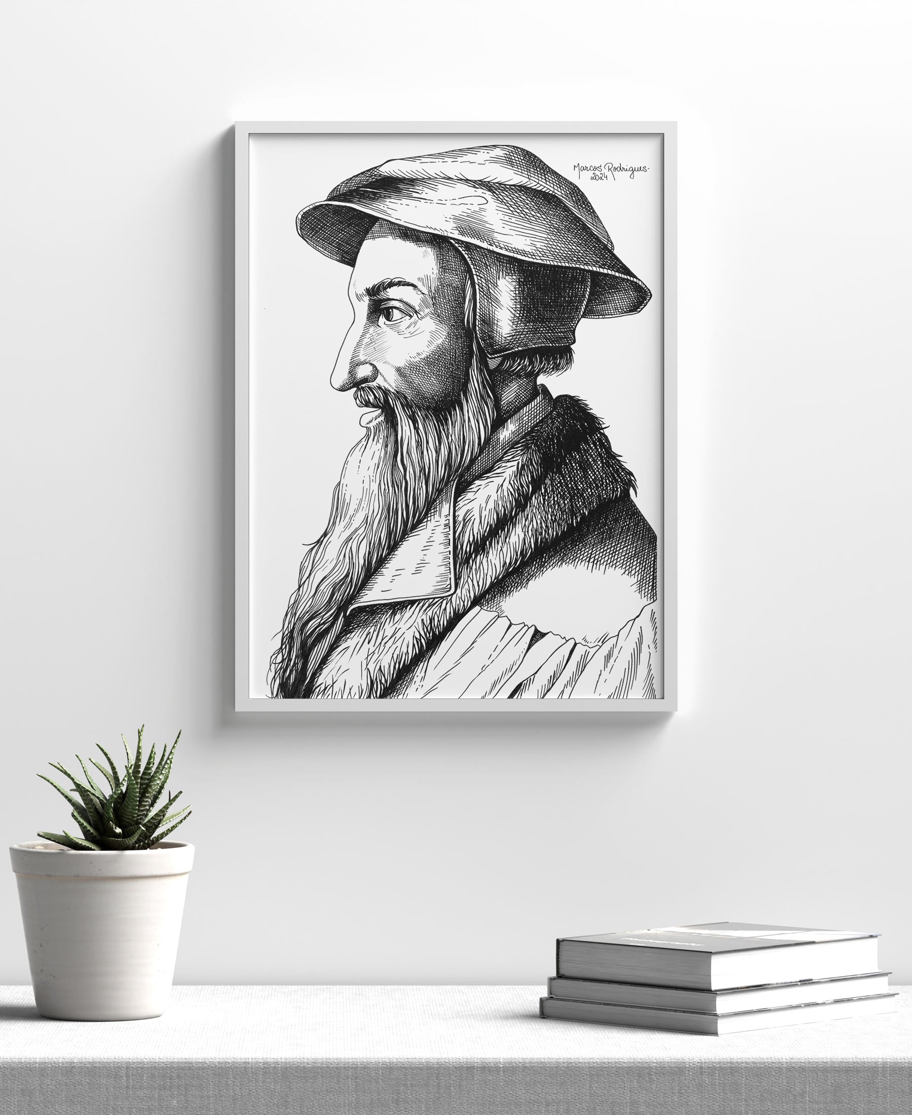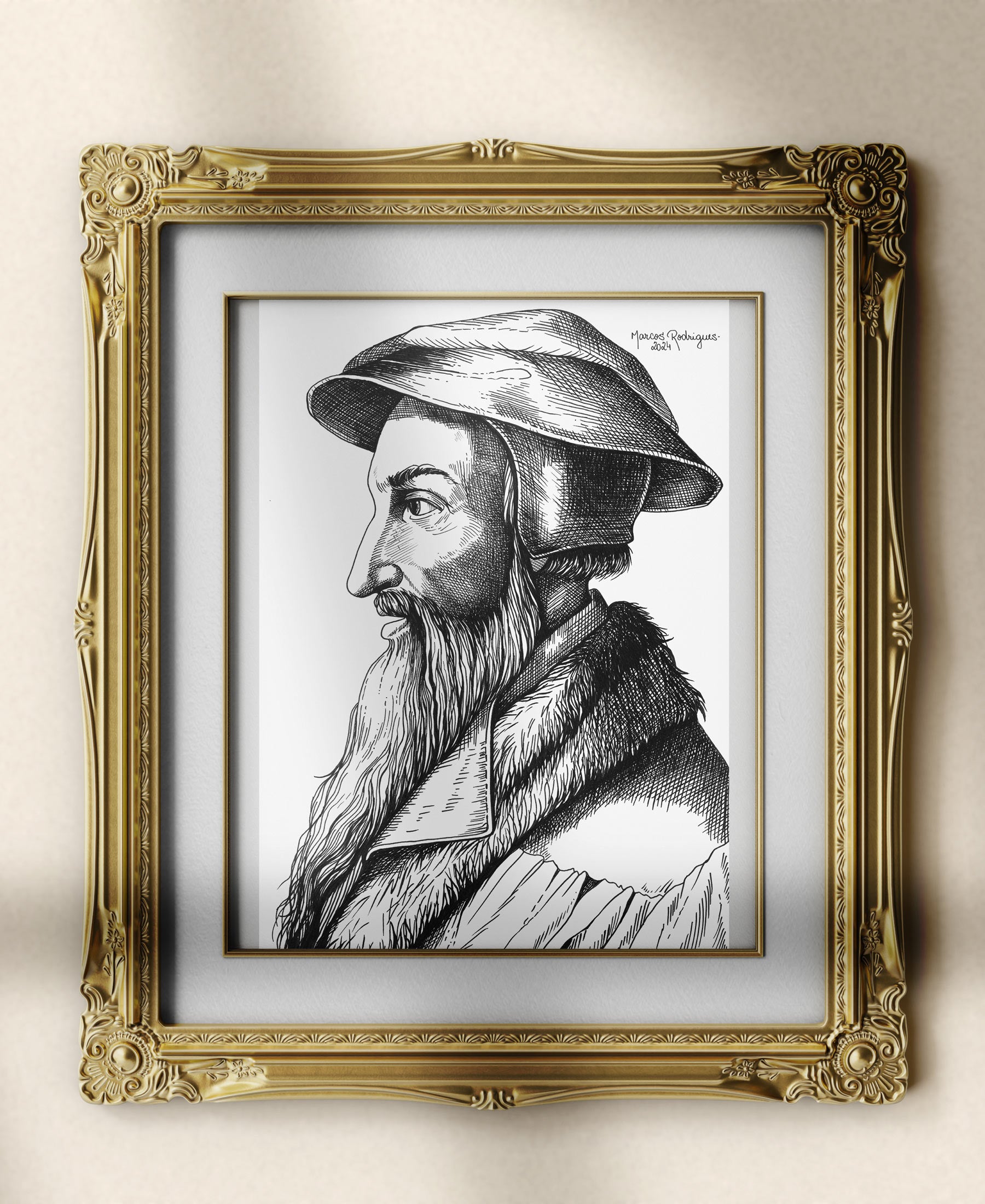 Print artístico exclusivo com o retrato de João Calvino (1509–1564), reformador francês e um dos principais teólogos da Reforma Protestante. Fundador da Academia de Genebra e autor das célebres Institutas da Religião Cristã, Calvino moldou a teologia reformada com ênfase na soberania de Deus, na graça irresistível e na centralidade das Escrituras.