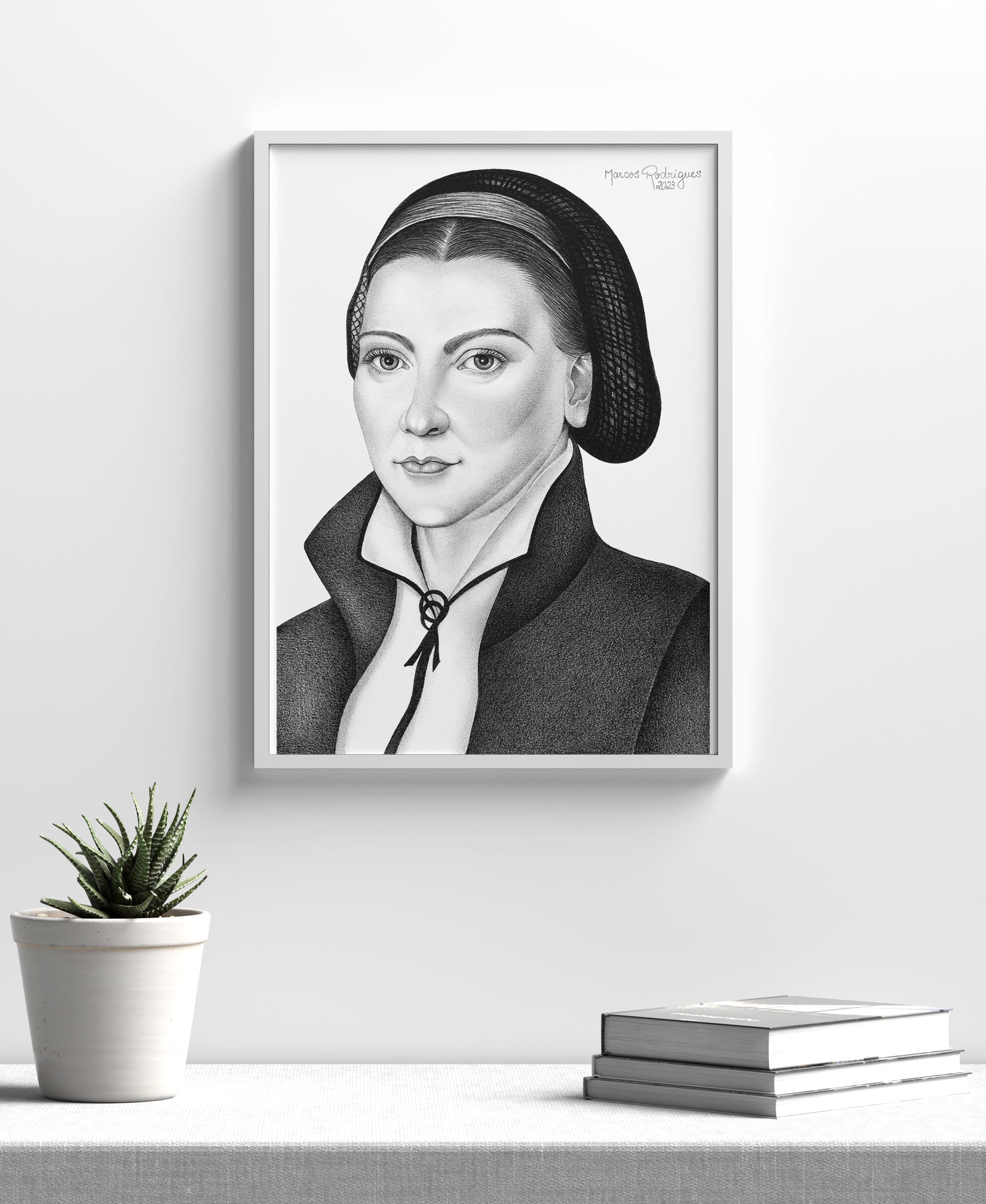 Print artístico exclusivo com o retrato de Katharina von Bora (1499 – 1552), mulher de fé e esposa de Martinho Lutero, conhecida como “a mãe da Reforma” por sua força, sabedoria e dedicação ao sustento do lar reformador em Wittenberg.