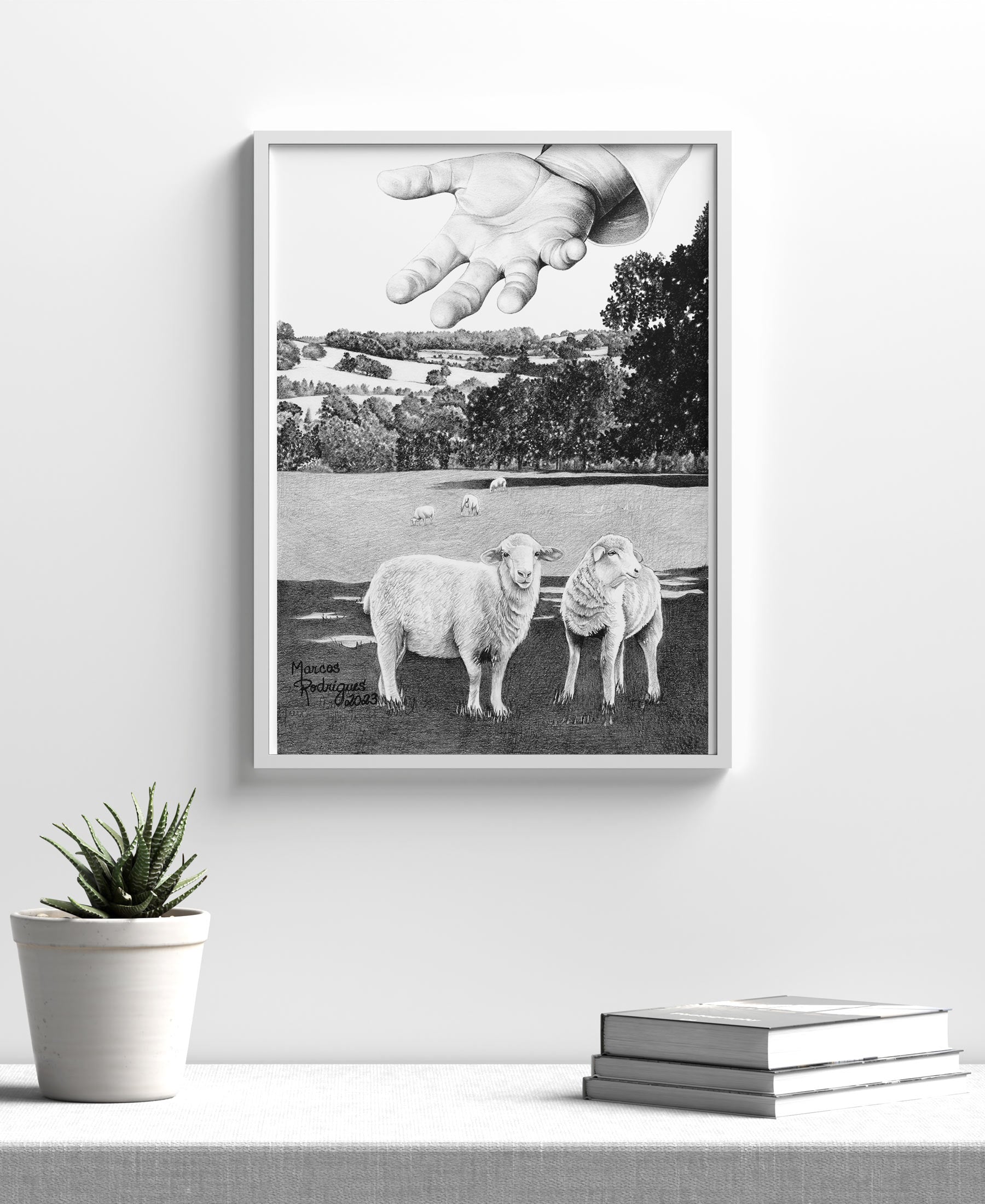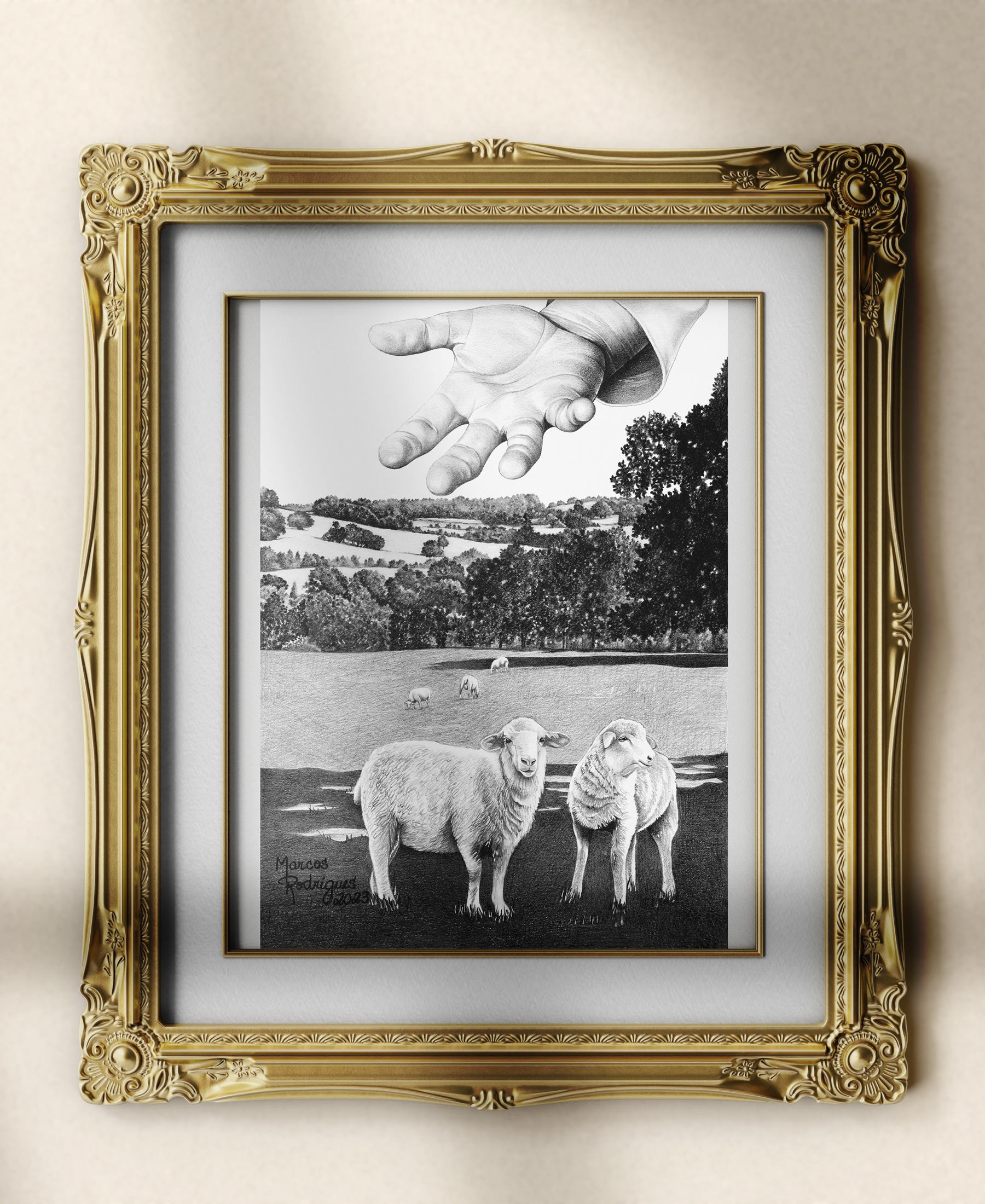 A obra retrata a mão de Deus estendida sobre o campo, simbolizando o cuidado soberano do Criador, enquanto as ovelhas pastam em segurança, representando o povo de Deus conduzido por Seu amor e fidelidade.