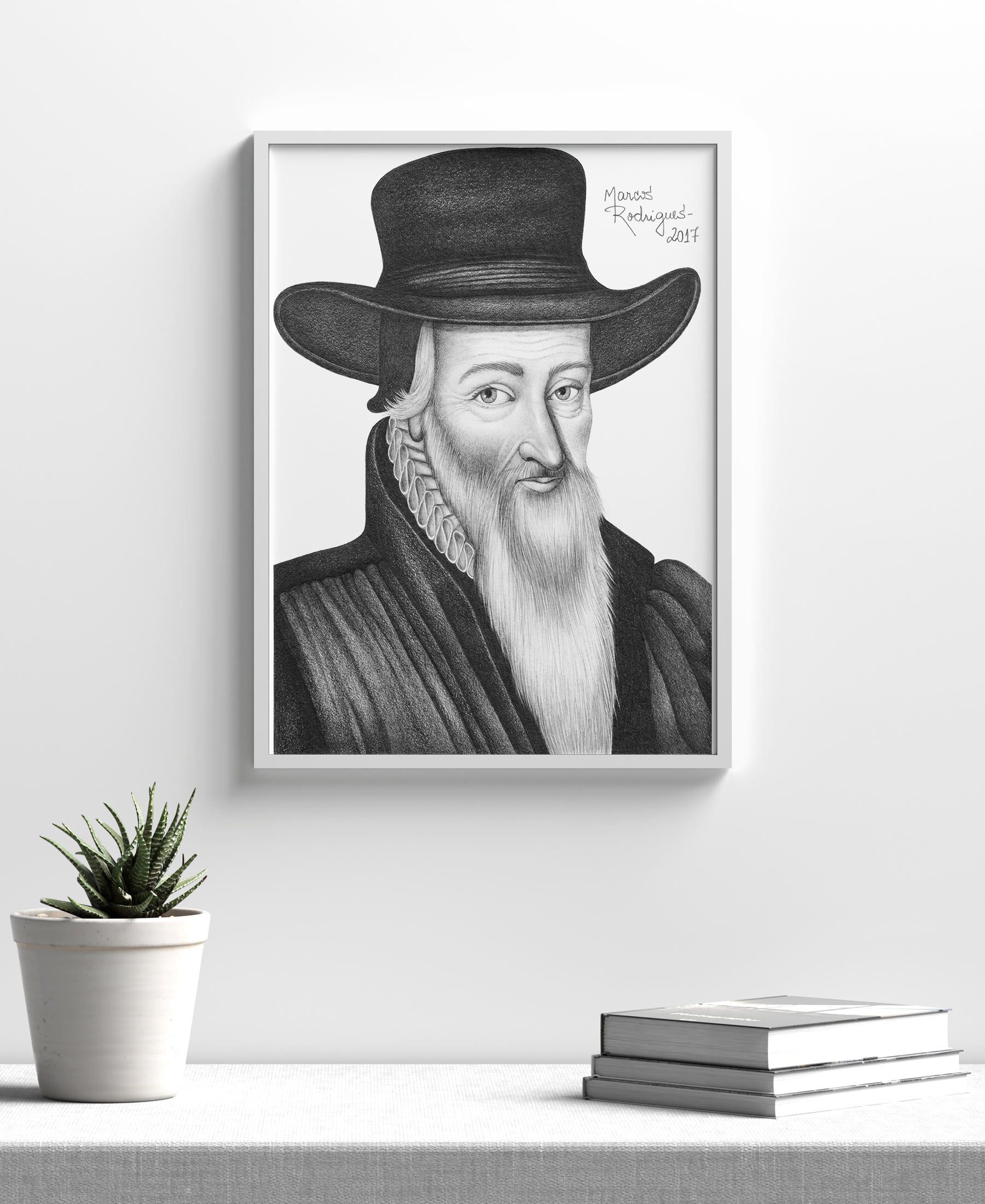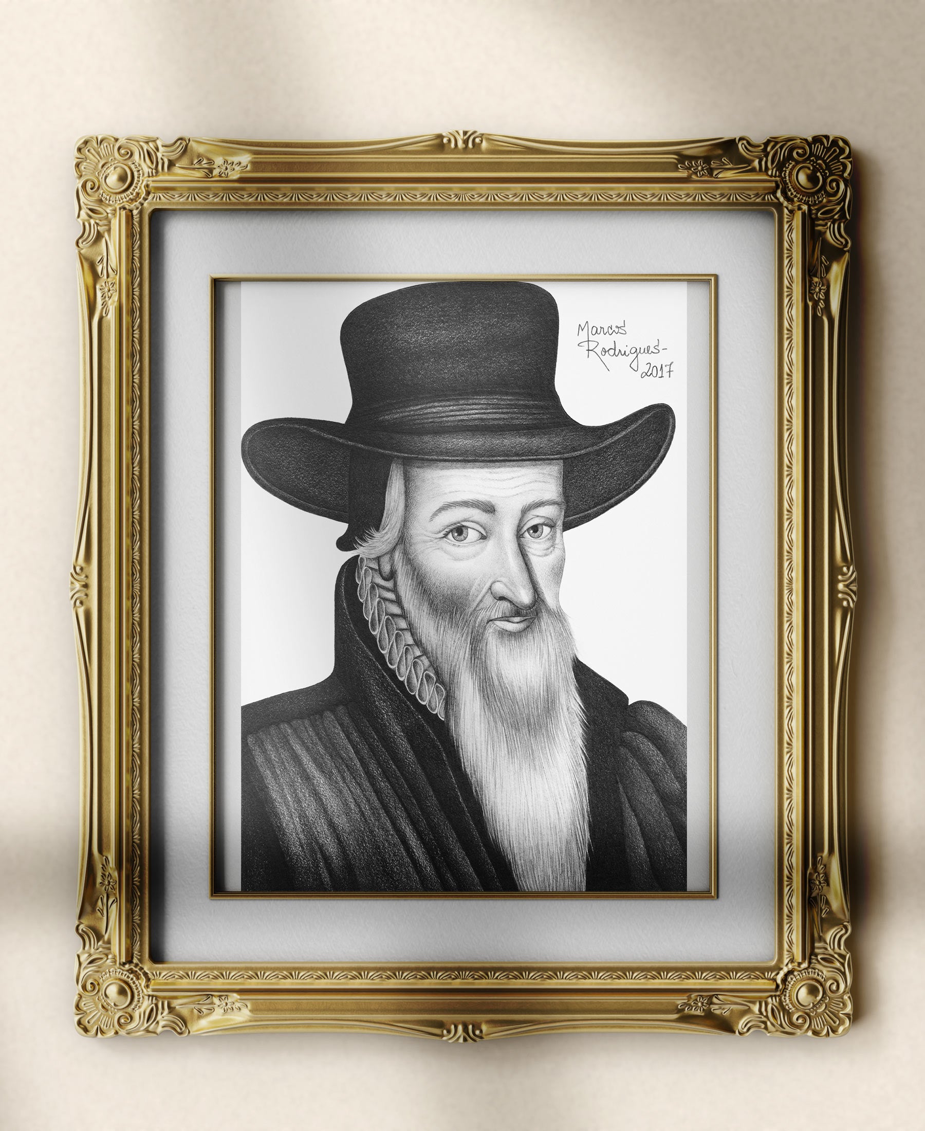 Print artístico exclusivo com o retrato de Teodoro de Beza (1519 – 1605), teólogo, humanista e pastor reformado francês, sucessor de João Calvino na liderança da Academia de Genebra e uma das figuras mais influentes da segunda geração da Reforma Protestante.