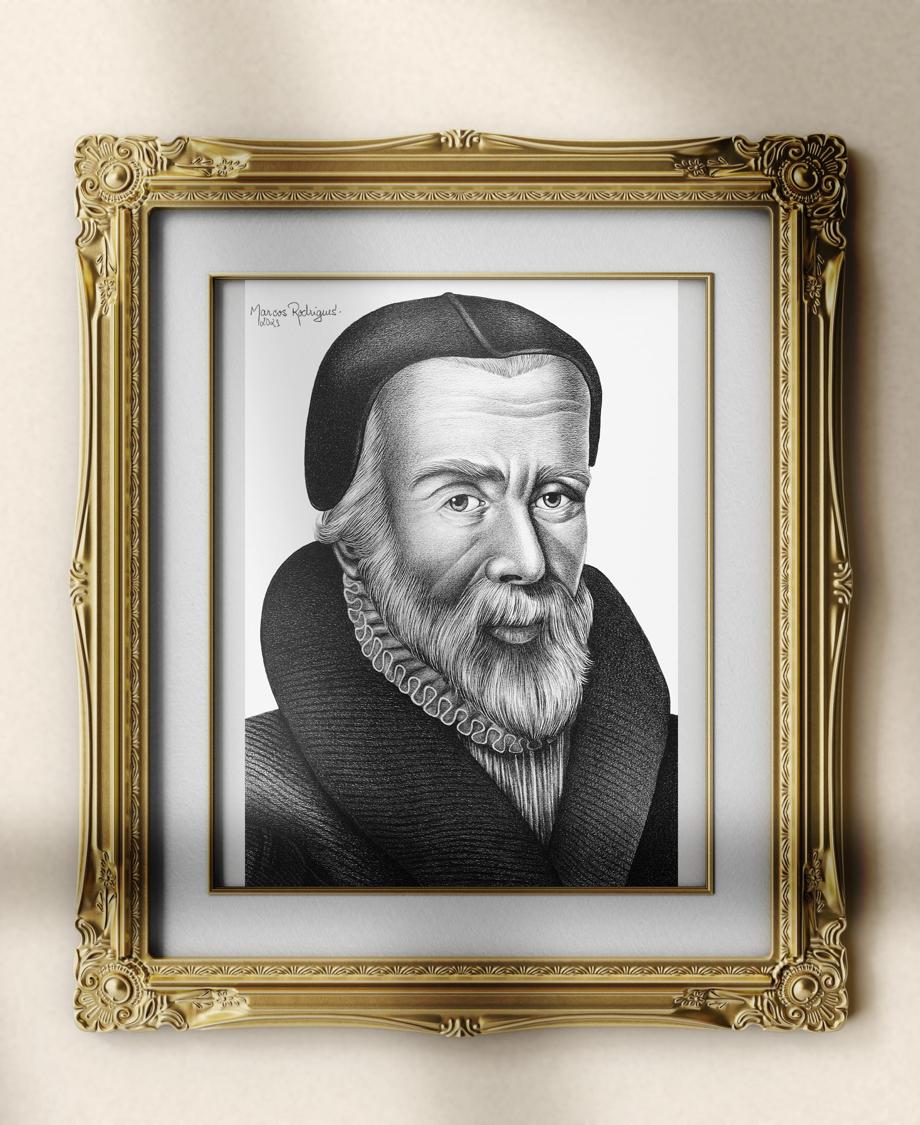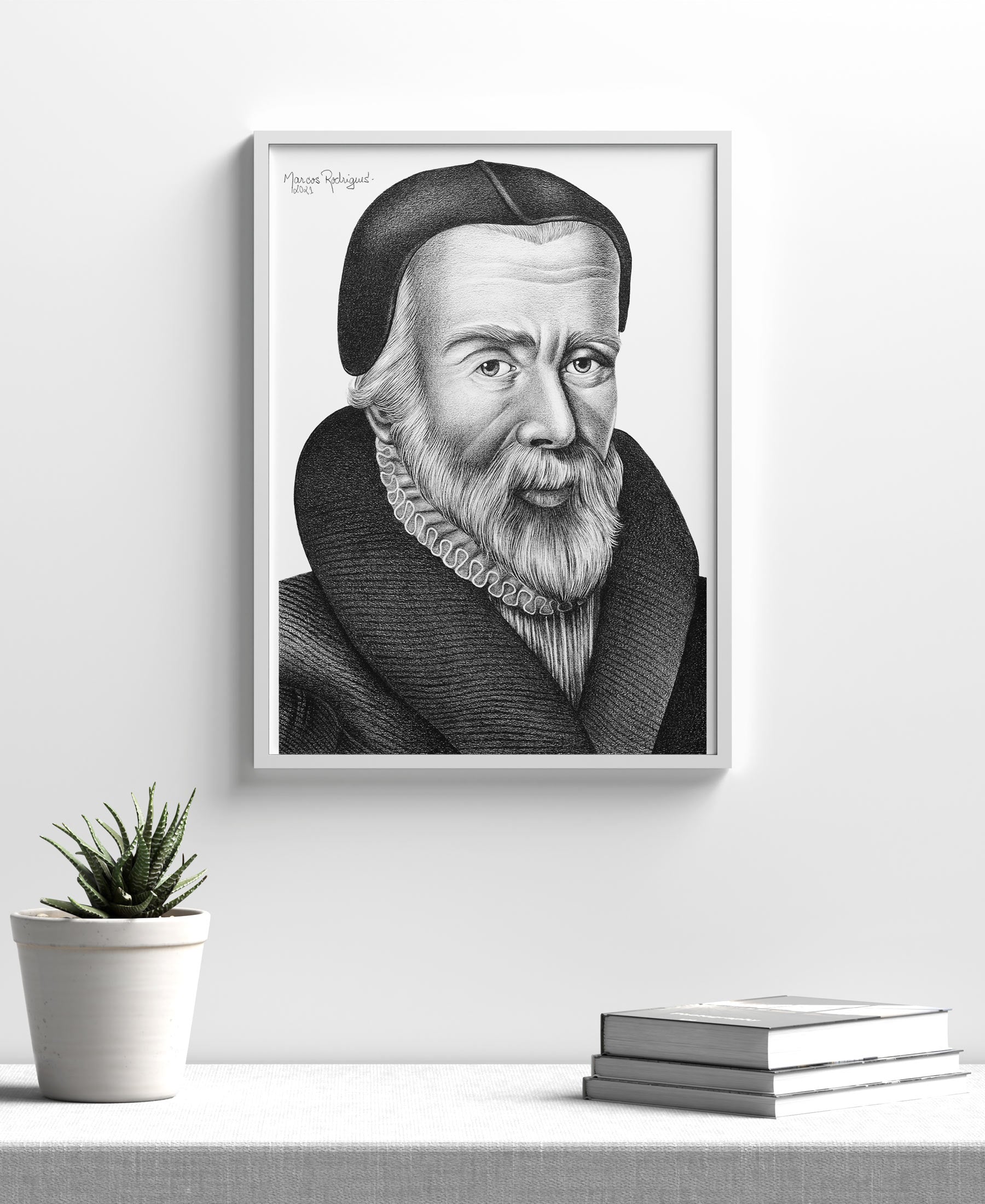 Print artístico exclusivo com o retrato de William Tyndale (1494 – 1536), teólogo, linguista e mártir cristão, reconhecido como o tradutor da Bíblia ao inglês moderno e um dos grandes precursores da Reforma Protestante na Inglaterra.